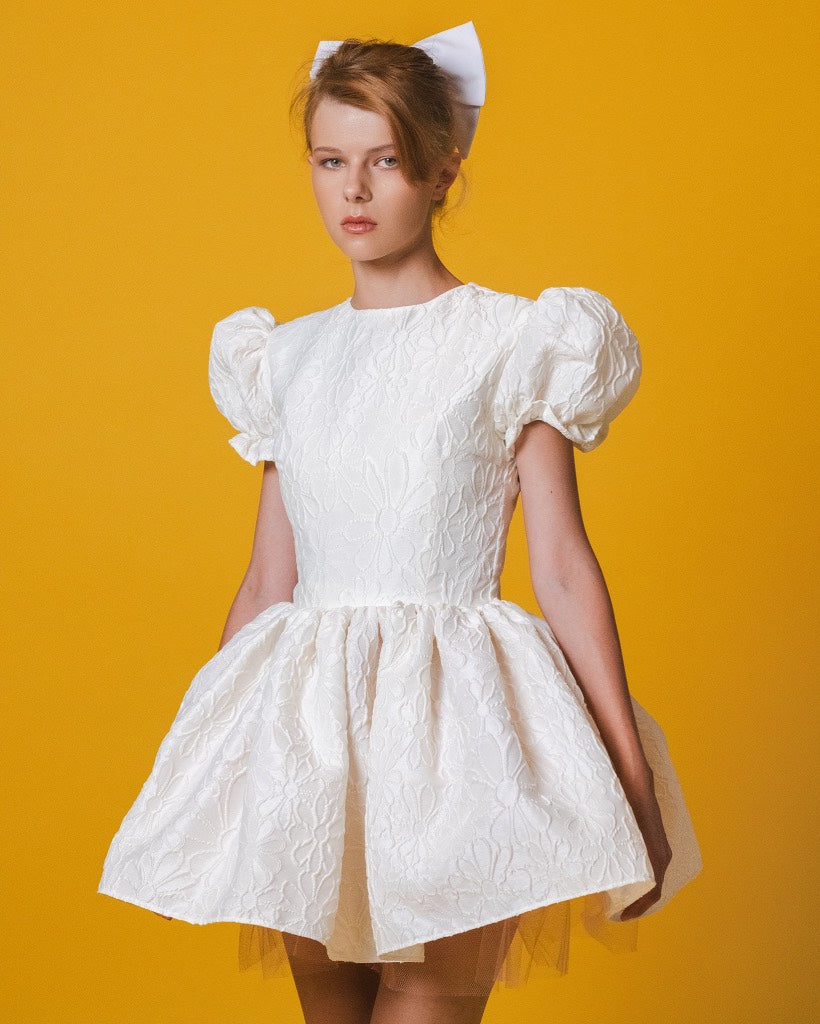 The Audrey Dress in White Floral Brocade