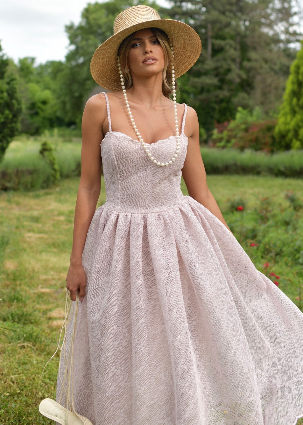Crafted from a moderately shimmery material, this dress is designed to make you feel like royalty under the sun. Its graceful silhouette and timeless charm make it the perfect choice for those special occasions. With its delicate detailing and a touch of shimmer, you’ll shine like a true princess while staying cool and comfortable during those warm summer days.